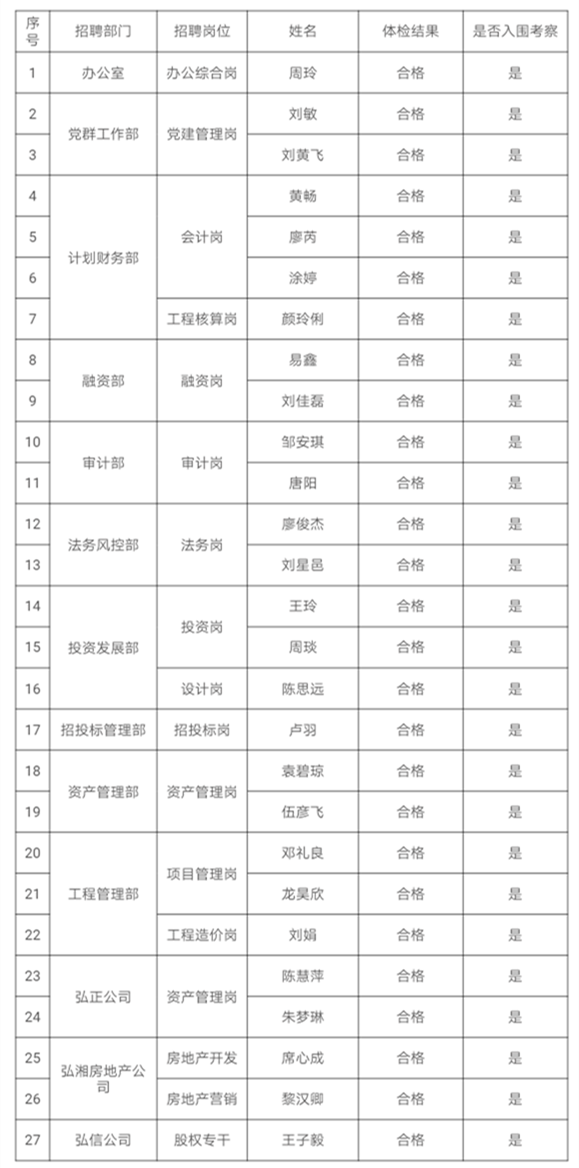 附件:衡陽弘湘國有投資(控股)集團有限公司2020年公開招聘員工體檢結果及入圍考察人員公示